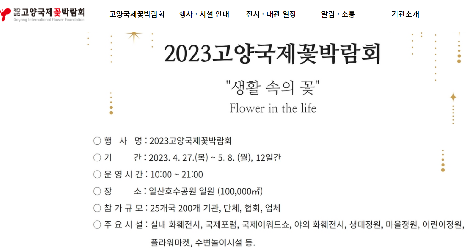 고양국제꽃박람회재단은 화훼산업·원예·조경 분야에 대한 전시·행사·교육·체험 등 화훼융복합 산업을 위한 전문기관으로 다양한 행사·시설 운영에 최선을 다하고 있습니다.